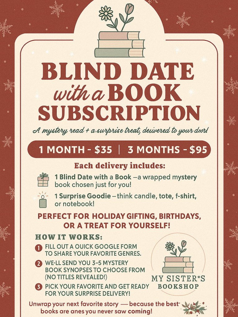 Looking for something thoughtful, unique, and full of surprise? Give the gift of a Blind Date with a Book Subscription from My Sister’s Bookshop! Each month brings a beautifully wrapped mystery read and a fun surprise goodie — all chosen with love.